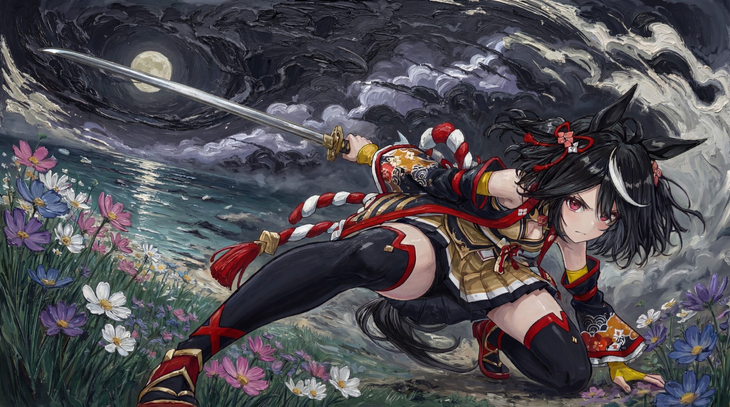月を切るような刀、月明かりが水面に反射する感じ、月に向かっていく立体感。